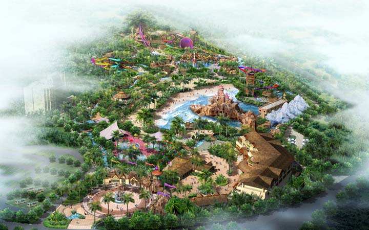 三亞夢幻水上樂園的的規(guī)劃布局高差分明,空間基地錯落有致,景觀空間以道路為脈絡、以山水為背景,通過“山體—叢林—水上”結合,實現(xiàn)立體化發(fā)展。主題元素結構是熱帶雨林、黎苗風情。通過熱帶雨林的地理景觀與黎苗民族的風貌結合為一體,高差錯落有致的景觀空間結構,營造立體化體驗氛圍。
