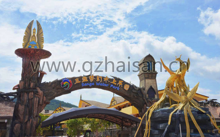 來到水上樂園,首先映入眼簾的是古老的樹型建筑和吉祥物鳳凰,給水上樂園帶來古樸的叢林氣息和神秘的色彩。進入門口,到達森林廣場,周邊所有的建筑都采用黎苗風格,包括裝飾、廣告、服裝、娛樂活動策劃等都以該主題文化為內(nèi)容和特色,充分體現(xiàn)了當?shù)氐拿袼罪L情。
