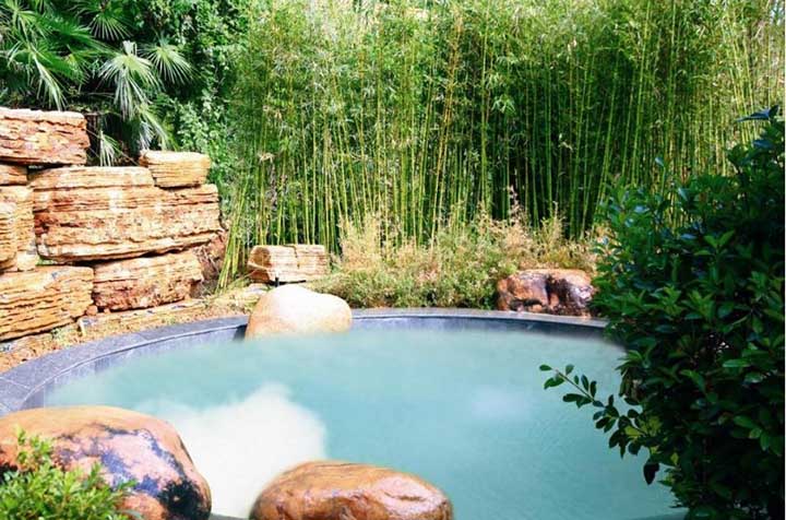 溫泉場地內(nèi)應(yīng)種植能適應(yīng)濕度較大、溫度較高環(huán)境的植物,且針闊混交,樹齡大、樹冠大較好。如云南省安寧市金方森林溫泉上部空間多采用具有日式庭院代表性的細(xì)葉類植物,如云南油杉等,營造了良好的遮蔭、清涼的效果;下部空間由于濕度大,多采用蕨類、八角金盤等,并且利用了層次較為分明的植物營造出泡溫泉的私密空間。